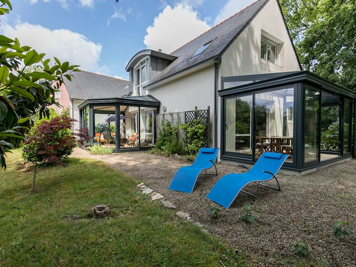 Gouesnach 6 km from Benodet: Beautiful single-family house "Les Bruyères", built in 2009. In the resort 1 km from the centre of Gouesnac'h, 5 km from the centre of Benodet, in a quiet position, 5 km from the sea, 5 km from the beach, in a cul-de-sac. Private: garden 1'500 m2 with lawn and trees, biotope. Terrace (20 m2), garden furniture, barbecue, roofed, parking on the premises, public parking on the road. Shop 5 km, grocery 900 m, supermarket 4.8 km, shopping centre 12 km, bar 900 m, bakery 4 km, bus stop 700 m, sandy beach "Benodet Beach" 5 km, thermal baths "Thalasso Benodet" 5 km. Sports harbour 5 km, marina 5 km, golf course (18 hole) 6 km, surf school 6 km, sailing school 6 km, minigolf 4 km. Nearby attractions: Quimper 17 km, Concarneau et Ville Close 20 km, Île Tudy 15 km, Pont l'Abbé 16 km, Embarcadère Le Îles Glénan 5 km, Pointe de la Torche 26 km. Please note: stretch of water approx. 15 m2 (10-50 cm) and 50 m from a stream (50 cm).