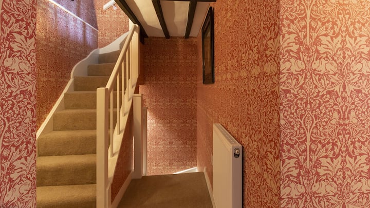 On entering the cottage, there is a small entrance area decorated with a floral terracotta red, William Morris-style wallpaper. To the left are the stairs to the first and second floor, and to the right the dining room, which leads through to the living room, courtyard garden and annex.