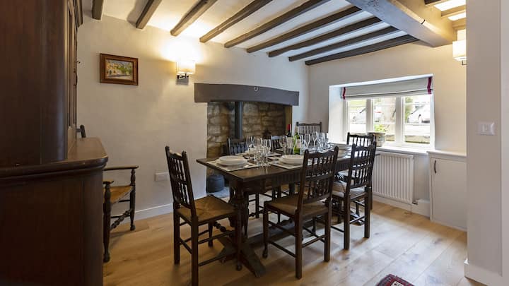 This traditional Cotswold home has been carefully refurbished to create the perfect mix of old and new. The Victorian inglenook fireplace, original beams (low in places, so mind your head!), wooden floors and terracotta red William Morris-style wallpaper are perfectly complemented with a modern, well equipped kitchen, three delightful bedrooms (two on the first floor and one on the top floor), three bathrooms and a downstairs cloakroom, plus a modern garden annex with twin beds.
