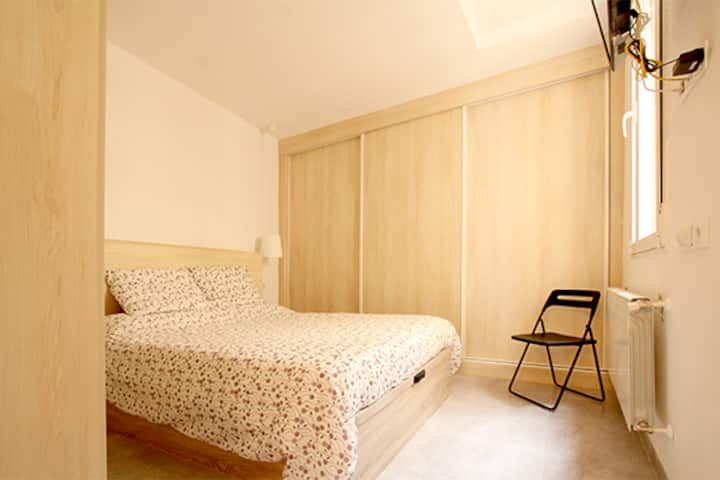 The master bedroom, featuring a 150cm-wide bed, is oriented towards a peaceful courtyard, ensuring privacy and tranquility. The apartment includes a full bathroom with a shower and a thoughtfully integrated kitchen at the entrance, maximizing space and functionality. The kitchen is equipped with modern appliances, including a large fridge, dishwasher, washing machine, microwave, coffee machine, and oven.