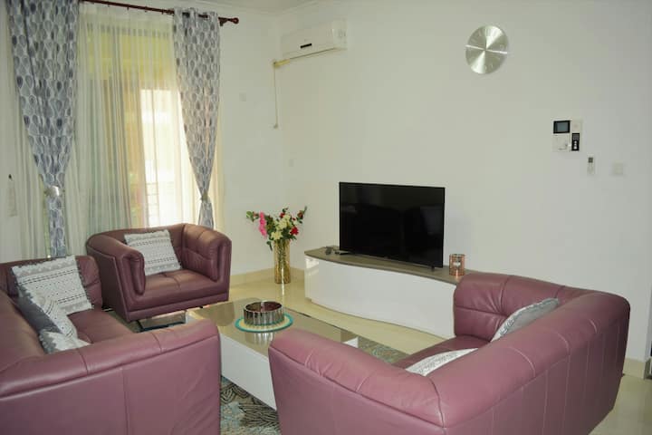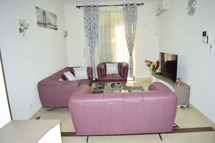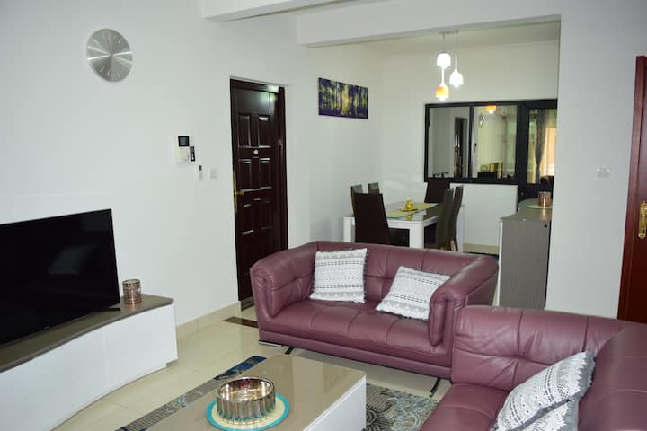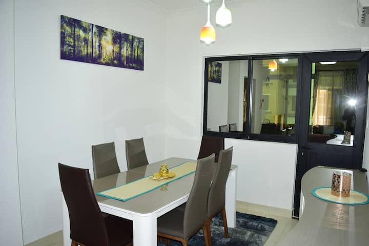Beautiful cozy, clean, and illuminated apartment. It has a laundry room and a shop connected to the kitchen(room for storing food)+2 balconies. Very well equipped you will find a washing machine, stovetop, microwave, etc. It is located in a magnificent residential area protected 24/7 by police officers at the entrance of the site, in addition our property has a speaker/video speaker that allows you to have a visual of the people ringing in your home. Non-stop electricity!