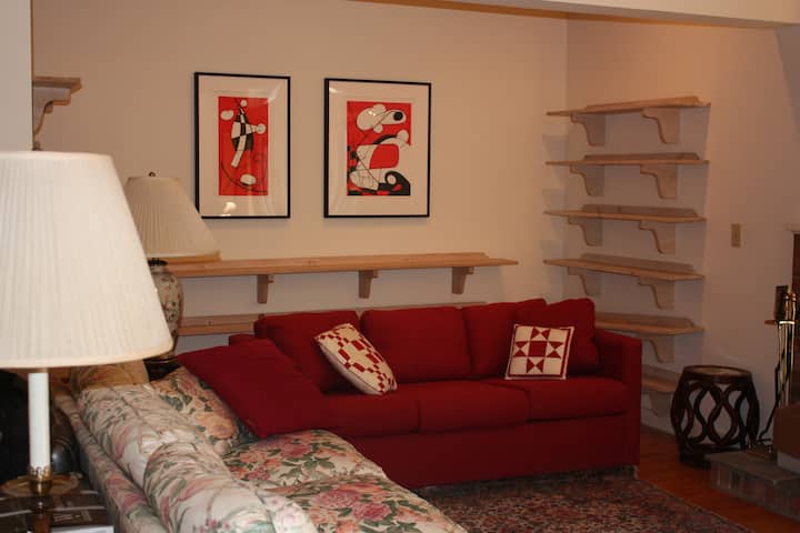 Rentals of 30+ days only! Contemporary 2-bedroom/2-bath house with a den that doubles as a 3rd bedroom. Modern kitchen, open living/dining area with dramatic cathedral ceilings and big windows looking out on the forest. Screened porch, open deck, and access to two nearby private lakes. Sleeps 8, pet and kid-friendly. 2 hrs from NYC & Boston, or fly into Hartford, CT, or Albany, NY. Close to Rte. 20 & Rte. 8, ten-minute drive to Lee. Near Jacob's Pillow, Tanglewood, and Shakespeare & Company.