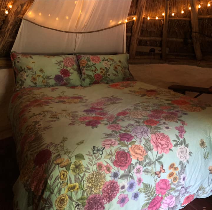 Inside the roundhouse, you'll find a comfortable double bed and romantic fairy lighting. Traditional thatch is a great insulator, so the roundhouse will stay lovely and cool on hot days and retain warmth on cool nights. There are also extra blankets and hot water bottles for colder evenings.