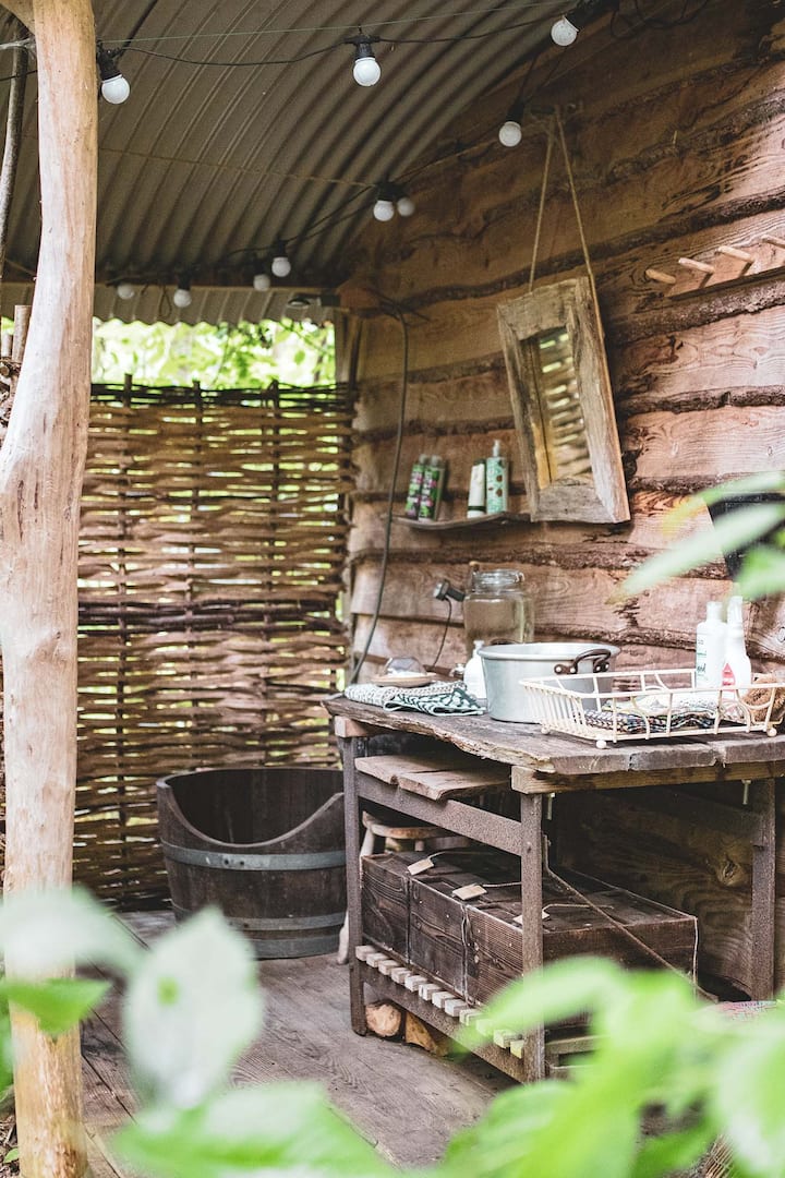 There's also a wash station in the covered deck area and a solar-powered shower. The water is heated over the fire or stove, and the solar panel powers the pump, once the water is ready. Woven hazel screens surrounded the shower for complete privacy. We'll provide lovely, local soap and towels. A great off-grid experience!