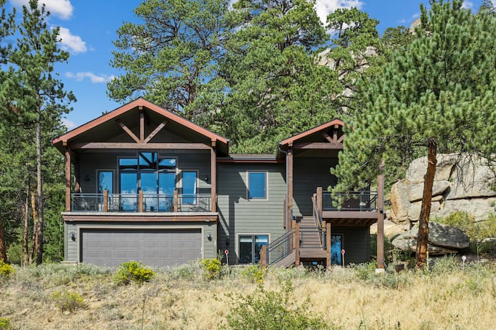 Escape to tranquility with this modern mountain retreat, nestled amidst the fragrant pines. Serenity Pines is an exquisite, air-conditioned haven conveniently situated less than a mile from downtown Estes Park and just under four miles from the Fall River entrance of Rocky Mountain National Park. This custom-built, four-bedroom, three-bathroom home spans an impressive 2600 square feet, offering an ideal backdrop for your upcoming vacation.