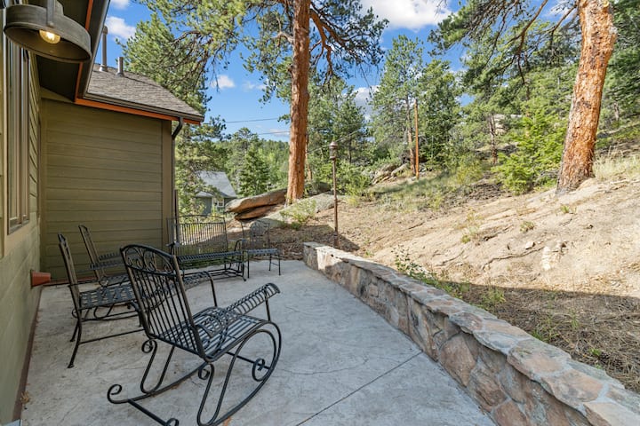 Step onto the front deck to savor views of the Estes Park Valley or venture to the stone back patio, nestled against lush wooded pines, for a delightful barbecue experience.