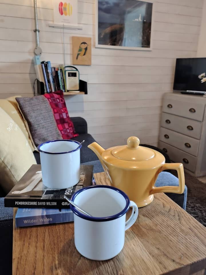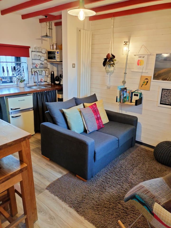 Comfortable lounge area with double sofa and gorgeous velvet tub chair. The TV has freeview channels, on-demand services and built in DVD players and we provide a DAB radio so you can relax in comfort. We have books about the local area, DVDs and boards games. A cosy spot to unwind and reminisce about your days adventures and plan future ones for the days ahead.