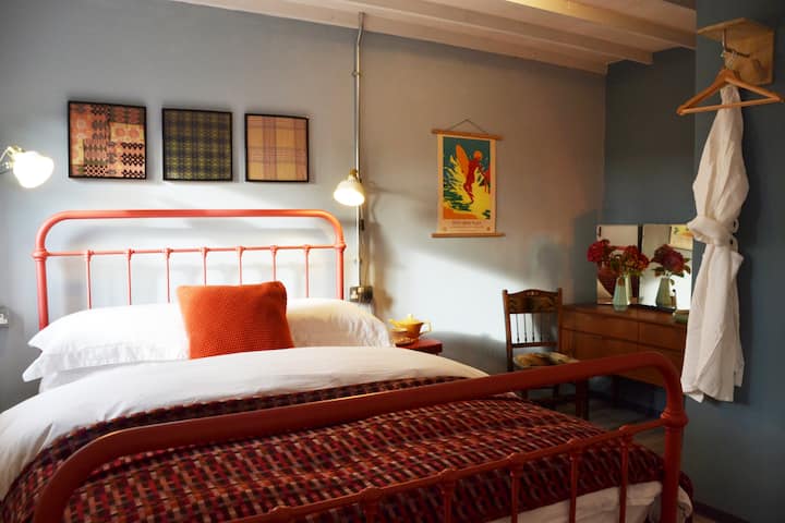 The double bedroom has a stunning traditional metal bed with feather duvet and welsh blankets for a great night's sleep after all that fresh air.