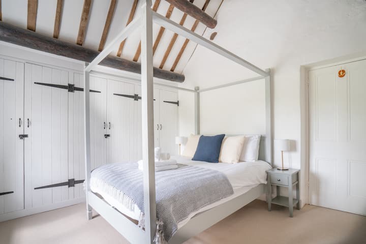 Master Bedroom:- 4 poster king sized bed with built in wardrobes. This bedroom has a magnificent vaulted ceiling with exposed beams and a traditional stone mullion window overlooking the road and open countryside to the front of the property