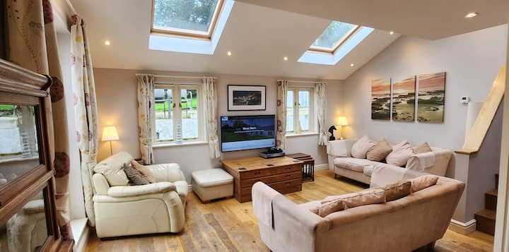 Entering the traditional, whitewashed barn from the ample parking area, you will be greeted by a large, stylish fully-equipped kitchen with integrated appliances, slate floor and high beamed ceiling. A farmhouse table is perfect for family meals. Moving through to the bright, open plan lounge, passing a downstairs toilet and double bedroom on the way, both ideal for the mobility impaired, the main seating area is drenched in natural light from large French doors and traditional windows as well as two Velux windows. With comfortable sofas, antique furniture and warm oak floors, guests can relax with a selection of books and DVDs, watch the large screen TV with Satellite and Freeview, or just gaze out at the garden watching farm animals grazing in the fields beyond.