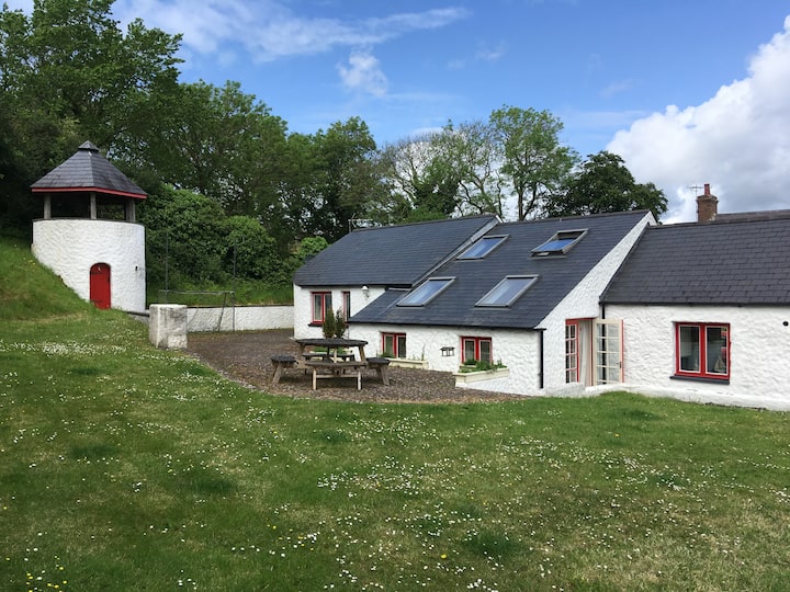 Outside is a huge open garden surrounded by fields, through which you can walk to the sea. You get your own garden space (non-enclosed) with patio furniture, BBQ and a "folly", all for your private use. Beyond this is further space shared with our neighbour and includes some activities for kids, including swings, football nets, slides etc.