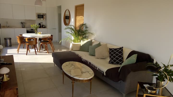 This is a very comfortable, bright (south-facing, sun from sunrise to sunset), air-conditioned accommodation for 6 people, with beautiful materials, and clear and warm decoration.