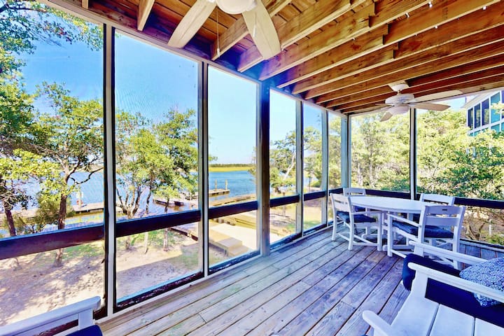 Marsh Mellow is the perfect waterfront escape on Bald Head Island for nature lovers and families alike. Nestled along pristine Bald Head Creek and the Salt Marsh Sanctuary, this home offers unbeatable access to kayaking, paddleboarding, fishing, and bird watching—right from the nearby dock. The toughest decision of the day? Whether to hit the beach, take the golf cart to the BHI Club's new water park, or unwind on the screened porch with a view.