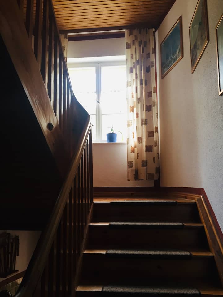 For this purpose, we have converted two of the former guest rooms into kitchens on the second floor, so that both wings can be used separately as holiday apartments. These are each around 85 square meters and offer sleeping accommodations for up to seven guests (three double rooms - two with bathroom in the room/ one with bathroom in the hallway). For large groups (extra charge) there is the possibility to book 3 more rooms on the second floor (2 double rooms/ 1 single room). When remodeling, it was important to me to preserve the original character of the rooms as much as possible, so we welcome especially lovers who appreciate rustic authenticity more than modern perfection.