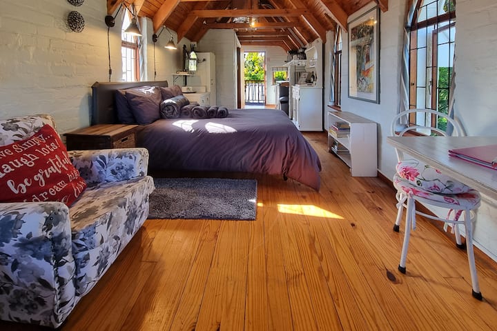 Our delightful loft studio apartment is ideally situated in Stuart's Hill, Somerset West, affording guests the perfect base from which to explore the Helderberg Basin (a collection of neighbouring towns, namely Somerset West, The Strand and Gordons Bay). Our beautiful area is nestled near the foot of the Helderberg Mountain and offers a host of outdoor attractions. Within a 5-minute drive, nature enthusiasts can experience a hike up the Helderberg Mountain or prepare a picnic and enjoy the sprawling lawn of the Helderberg Nature Reserve. A 15-minute drive will get you to our golden, sand-covered beaches or a visit to the Cheetah Outreach preservation centre. There are no less than 6 golf courses within a short drive, the closest being a 7-minute drive to the Erinvale Golf Estate Hotel and Spa. Plenty of restaurants, coffee shops, day spa, hair salon & barber, craft market, curio shops, art galleries, grocery store, pharmacy, information centre, and more are within short walking distance from the Studio on McLeod.