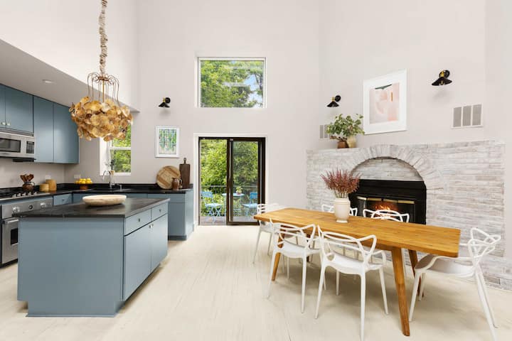 Step inside and be instantly impressed by soaring double-height ceilings, skylights, and the grand scale of this 25’ wide by 46’ deep home. The main level boasts 18’ ceilings and an expansive open-concept living, dining, and kitchen area with exposed brick, a wood-burning fireplace, and a sunny terrace just off the kitchen — perfect for morning coffee. The windowed chef’s kitchen features top-of-the-line Viking and Bosch appliances.