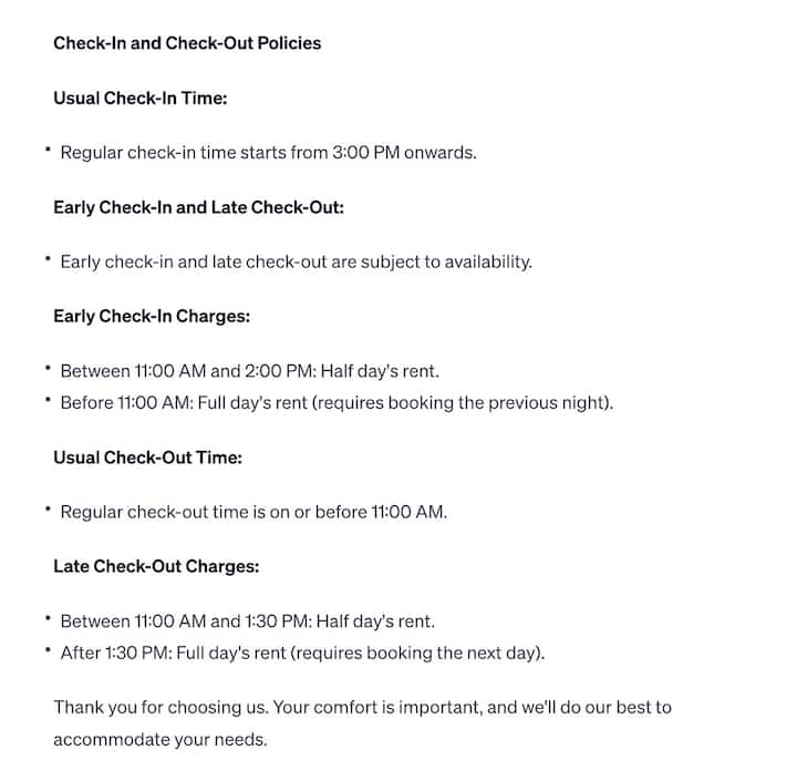 Check-out Time: 8am to 11am IST. If you require an early hours check-out, please discuss with Hosts to make special arrangements.