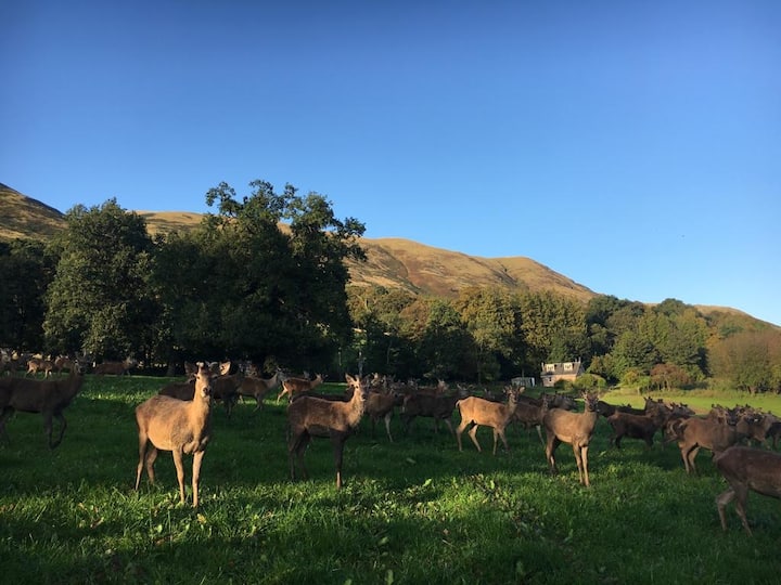 Deer Park cottage is situated within the private Scottish estate garden and is surrounded by the deer park. It is the most secluded of cottages and offers a very private and natural hideaway. Powered by wood pellet boiler and on its own water system supplied from the Ochills you can feel completely at one with nature. On occasions you can wake up to deer grazing within feet of your bedroom window and be lulled to sleep by the hooting of owls or wind blowing through the trees.