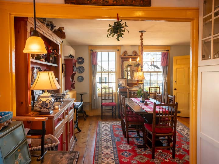 The 1784 Denison Home property, an antique center colonial historic home, can accommodate up to ten guests and is adjacent to the Williams Home property.