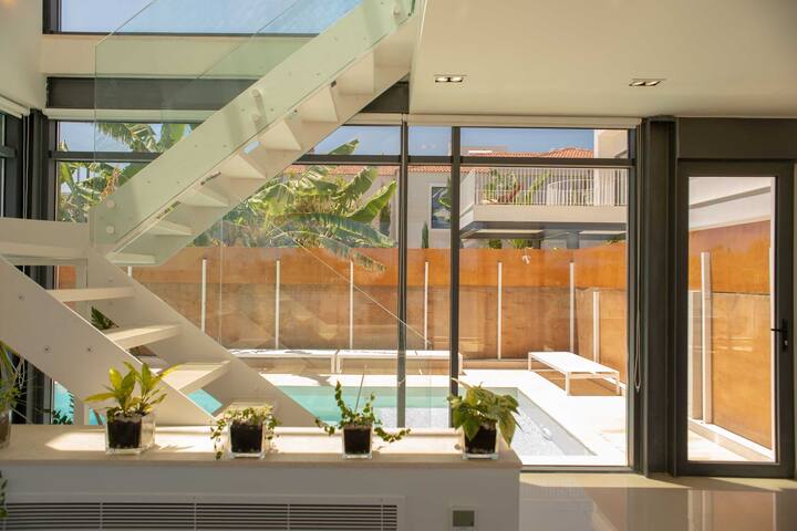 On the first floor the guests will find the master bedroom with a double bed and an en-suite bathroom with shower. The room extends into a small living area with a glass floor just above the pool.