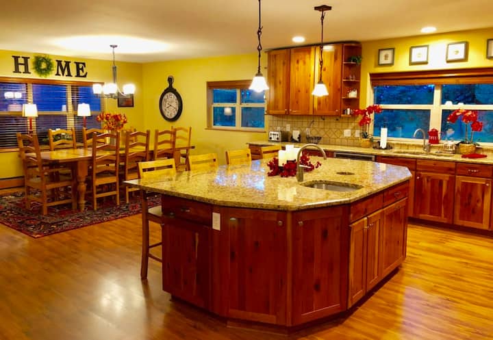 The main home features a large gourmet kitchen/great room where everyone can gather to cook, eat meals and socialize in a common area. Just off the kitchen is a large living room with 2 sofas and a love seat surrounding a gas fireplace. The living room has a large 4K TV for watching sports, movies or just visiting and catching up. The wraparound log porch has more seating, BBQ and Smoker Grills, and a 24' long wood picnic table for outdoor meals. There is also a large hot tub which can seat 6-8. There are 15 rustic wood picnic tables available for outdoor gatherings on the property with an outdoor gas fire pit for evening ambiance and roasting s'mores. (Only available when there is no fire restriction/ban and MUST be attended at ALL times when burning.)