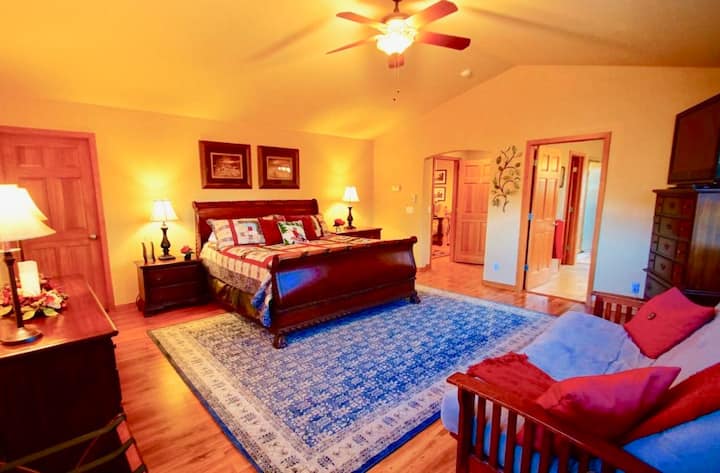 Bedroom #6 is a studio apartment on the main floor with a King Bed, private bath and French doors leading to the outside for a private entrance if wanted. It has a kitchenette with a full size refrigerator, sink, microwave, coffee maker and electric tea kettle. No stairs, wide doors, and the shower has a seat and only a 4" curb to get in. Great for family members with limited mobility.