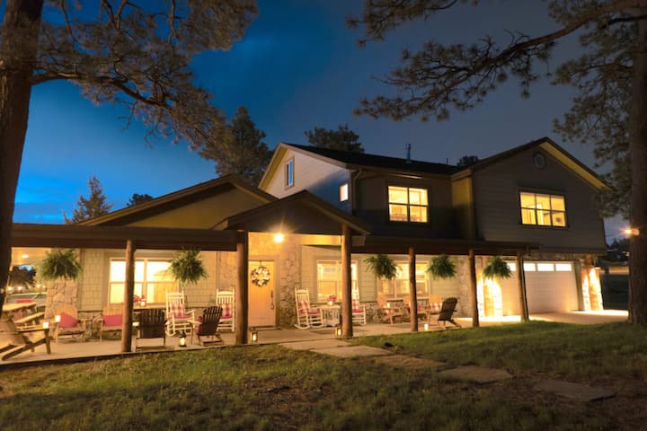 The Colorado Lodge on Lookout Mountain home features a large fully equipped gourmet kitchen/great room where everyone can gather to cook, eat meals and socialize in a common area. Just off the kitchen is a large living room with easy chairs and couches surrounding a cozy gas fireplace and a large 4K TV for watching sports/movies/Netflix, or just visiting and catching up. The wraparound log porch has more seating, 2 BBQ/smoker grills, and a 24' long wood picnic table for outdoor meals. The log porch also has a large hot tub which can seat 6-8. There are 15 picnic tables (5 - 120" X 29"..... 11 - 96" X 29") available for outdoor gatherings (up to 50 people) on the property and an outdoor a gas fire pit for gathering around at night and roasting s'mores. The ability to bring in your own food and beverages makes for a big cost saving. Having the lodging and events at one place makes logistics so much easier and more relaxing. Having time to hang out with your friends and family in a casual atmosphere creates strong bonds and lasting memories. Cornhole, Disc Golf, horseshoes, tetherball, badminton, croquet, etc. while cooking, smoking and barbecuing meals makes for a really nice family gathering.