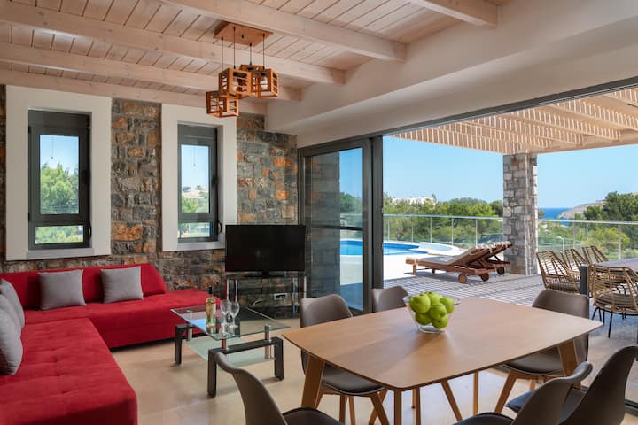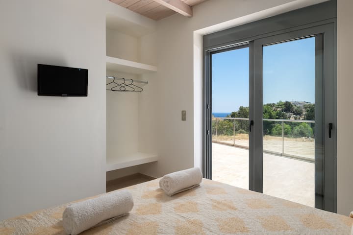 Our villas are newly built and luxuriously decorated to high standards. They are stone built, showing a traditional and simultaneously a modern style. The bedrooms lead to large balconies or terraces with outdoor furniture and panoramic views, ideal for enjoying romantic sunsets or the starlit nights.