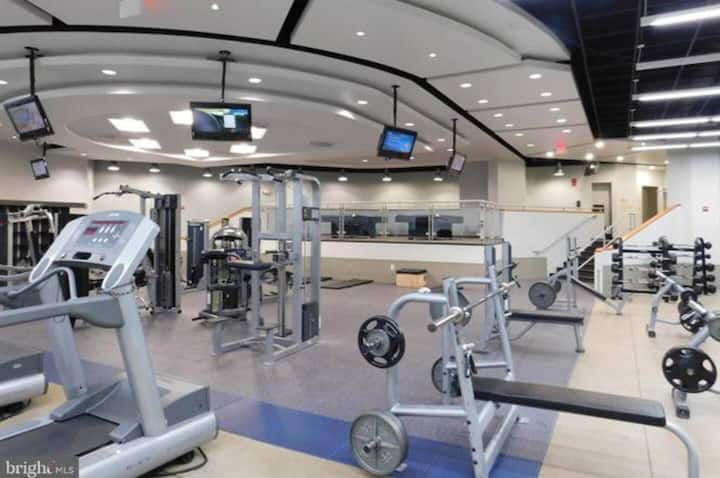 The treadmill, stationary bike, yoga mat and free weights are ready for workouts.