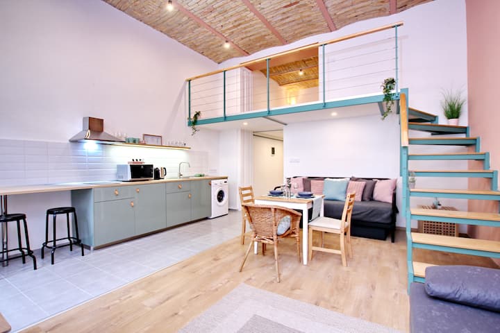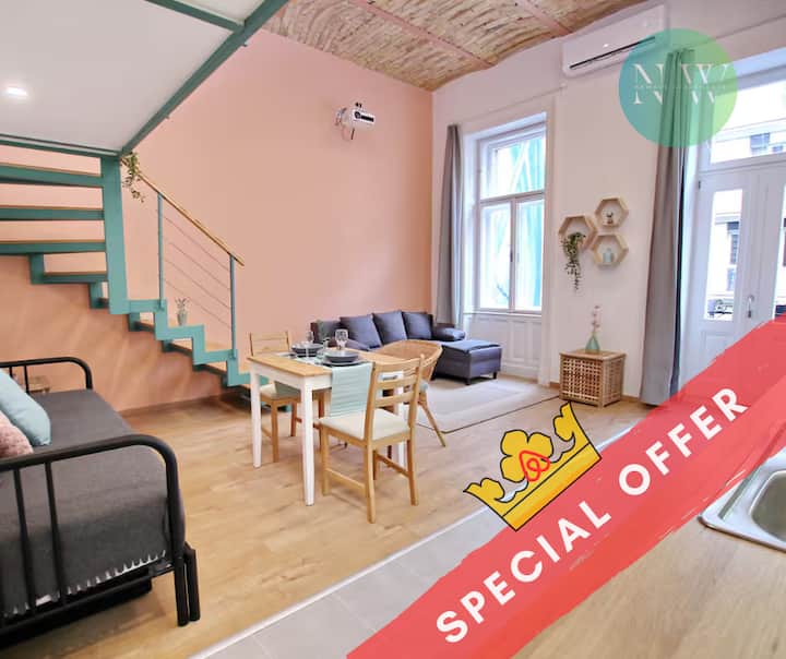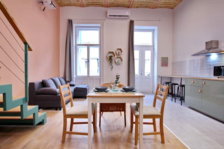Discover Budapest’s vibrant city life from our stylish studio , perfect for up to 6 guests. The mezzanine offers a queen bed, while the living room features two pull-out sofa beds. Enjoy free WiFi, Netflix, a private balcony, a coffee machine with capsules, and a mounted projector for a cozy cinema experience. The apartment also includes a baby bed, hairdryer, iron, bed linens, towels, a fully equipped kitchen, and a modern bathroom for a comfortable stay.