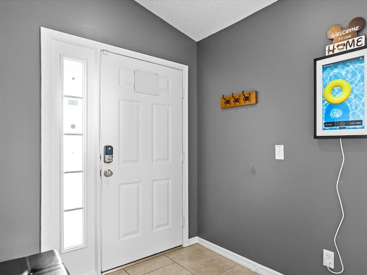 Welcome to our home. A Disney-themed 4 bedroom, 3 bath villa with sunny south-facing swimming pool, spa, and games room, all within a 7-minute drive to Disney World! Located in the gated resort community of Emerald Island, just south of I-92 and Animal Kingdom Park. There is 24-hour guard-gated security, club house with a fitness center, sauna, community pool, and a poolside Tiki bar for when you need to unwind. There is a nature walking trail, as well as a beach volleyball court, tennis court, mini golf course, rentable bikes, and a basketball court. A basketball and tennis rackets and tennis balls are located in the garage to use at your pleasure.