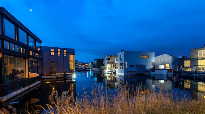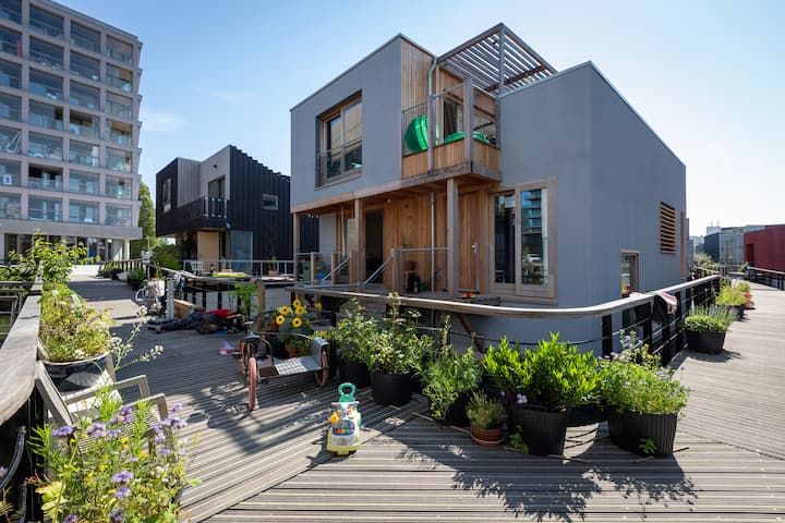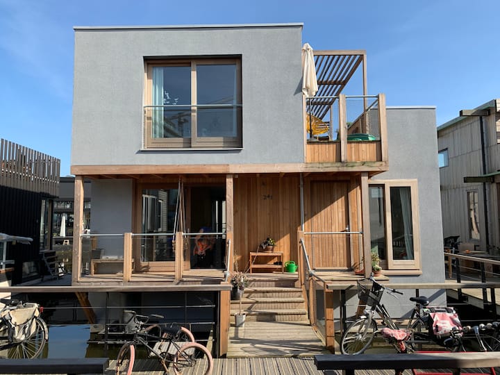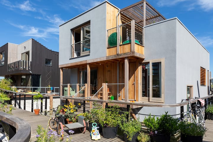 After having lived in the center of Amsterdam for 18 years, we have made the move to a new part of the city, Amsterdam North. We have built a beautiful floating house in the Schoonschip neighbourhood, which is the most sustainable floating neighbourhood of Europe.