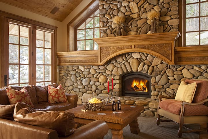 Beyond the picture windows and outdoors sits an immaculate, 2 tiered stone terrace offering guests a perfect all season gathering space. The luxurious amenities include an 8 person hot tub, sitting area for dining outdoors or to simply enjoy the views, a gas fire pit and built in gas grill. Winter guests can relish the ski in/ski out access steps off the stone patio while summer guests can savor an additional sitting space overlooking the mountain.