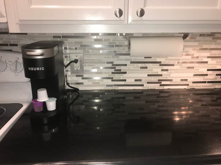 - Kitchen including full Stove/Oven, Keurig, Toaster, plates, cups and more