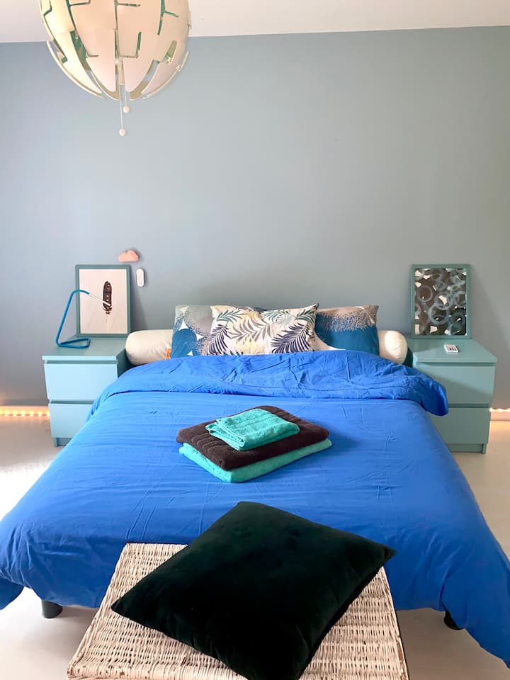 Bedroom 1, master bedroom with king-size mattress, new measuring 2m x 2m. Direct access to the bathroom through a lockable sliding door.