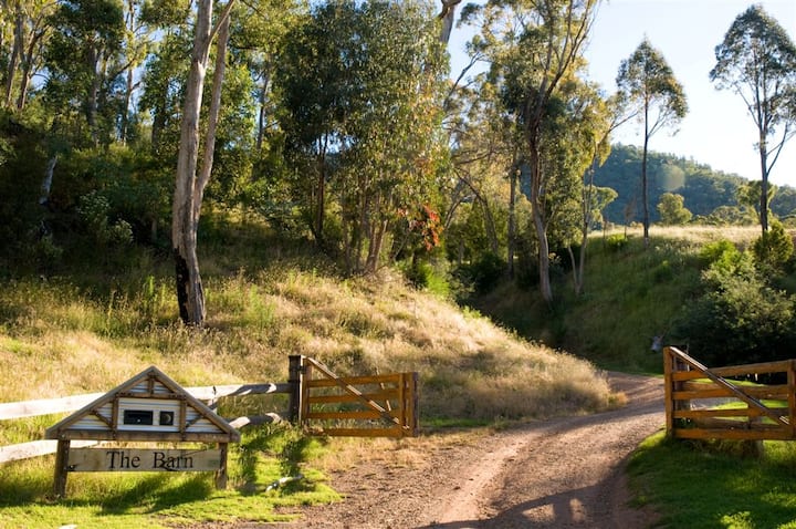 Bright Barn Retreat comprises of a main house of huge proportions;,The Barn, and a ground floor studio, situated high on a hill of 17 private acres of land with kangaroos. The backdrop of the Victorian State Forest and the north facing views of the Alpine Valley are stunning.