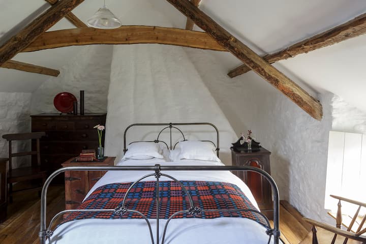 Second bedroom with double antique Welsh box-bed (sleeps 2) slightly shorter and narrower than a modern bed and therefore not suitable for tall adults. This room is entered from the main bedroom.
