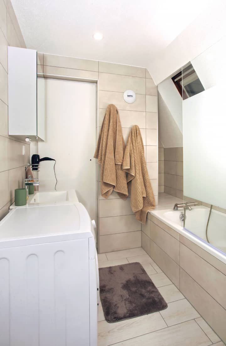 Opposite the vanity unit, the bathtub with glass wall. Ideal for a bath or shower without putting water everywhere! When exiting the bathtub, hooks are available on the wall to hang your towel. We really thought of everything!