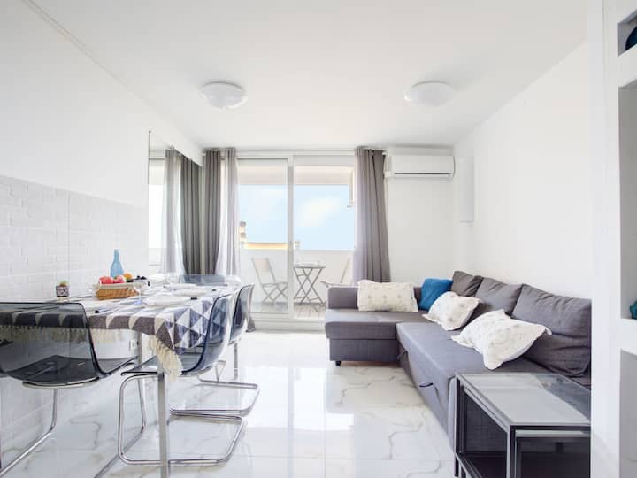 1-room studio 20 m2. Living/dining room with 1 sofabed (140 cm, length 190 cm), 1 x 3 bunk beds (90 cm, length 190 cm), TV. Exit to the terrace. Kitchenette (2 ceramic glass hob hotplates, microwave, electric coffee machine). Shower/WC. No heating option. Terrace. Terrace furniture. View of the sea. Facilities: Internet (WiFi, free).