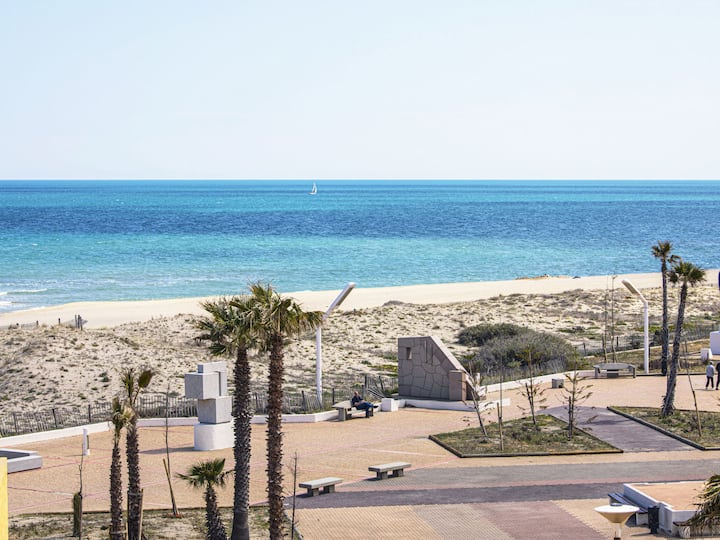 Residence "Vistaéro", 3 storeys. In the district of la Grande Plage, 50 m from the sea, 50 m from the beach, direct access to the beach. In the complex: parking. Shop, grocery 100 m, supermarket 5 km, shopping centre, restaurant, bar, bakery, café, bicycle rental 100 m, bus stop "Lydia" 180 m, railway station "La Franqui" 20 km, sandy beach 50 m, diving center 5 km, nudist beach 10 km. Sports harbour 7 km, surf school 3 km, sailing school 2 km, tennis 4 km, minigolf 4 km, riding stable 7 km. Nearby attractions: Aqualand Port Leucate 7 km, Réserve Africaine de Sigean 41 km, Fort de Salses 20 km, Narbonne 55 km, Perpignan 25 km, Barcelone 215 km. Well-known lakes can easily be reached: Etang de Leucate ou Salses 7 km, Lac de Villeneuve de La Raho 28 km. Hiking paths: Sentier du guetteur 8 km, Station meteorologique de Opoul Perillos 25 km, Sentier du littoral Collioure 40 km. Please note: Additional accommodations can be booked.