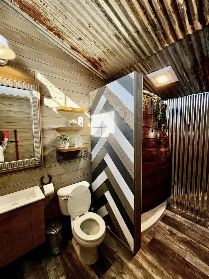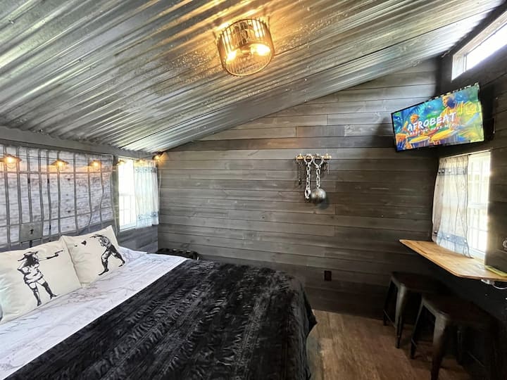 Tiny 250 square foot Mini-Cabin: Sleep soundly on a queen-size, plush velvet bed surrounded by rustic shiplap walls, nostalgic old-west “wanted” posters, and a charming tin ceiling