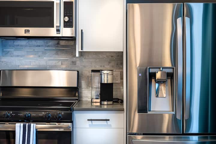 KITCHEN: Stove/oven, microwave, refrigerator, coffee maker, toaster, cooking basics, dishware/flatware, dishwasher, garbage disposal, ice maker, and spices.