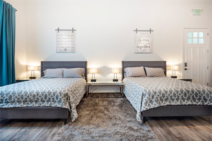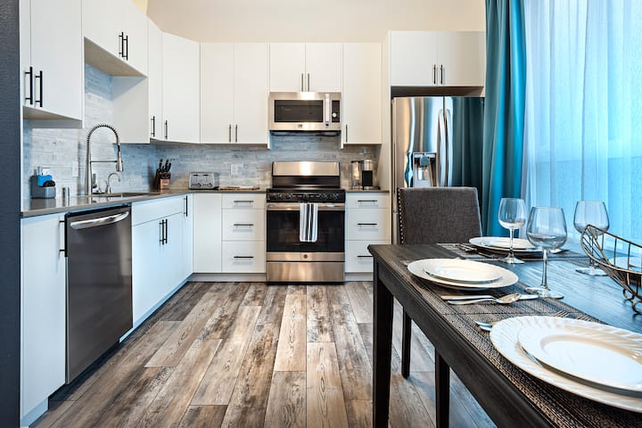 INDOOR LIVING: Smart TV, dining table, cabinets, memory foam mattresses, and open-concept layout