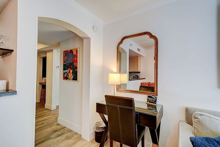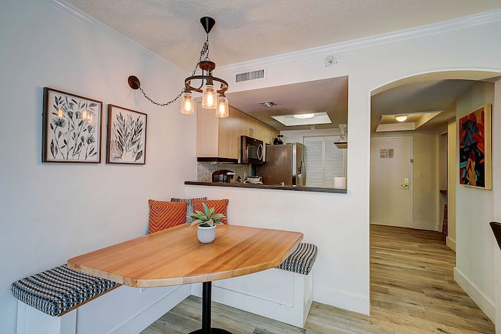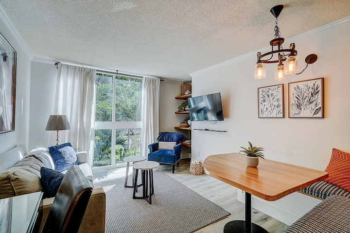 ABOUT THE APARTMENT: Stay in this newly decorated unit that can accommodate up to 4 people comfortably! The unit has a fully equipped kitchen with stainless steel appliances & Keurig Coffee machine. Living area includes a queen size sleeper sofa, dining area and workspace for checking emails. Bedroom has a queen sized bed and spacious walk-in closet. There is also a renovated bathroom with walk in shower. Enjoy the lush tropical foliage from the picturesque windows.