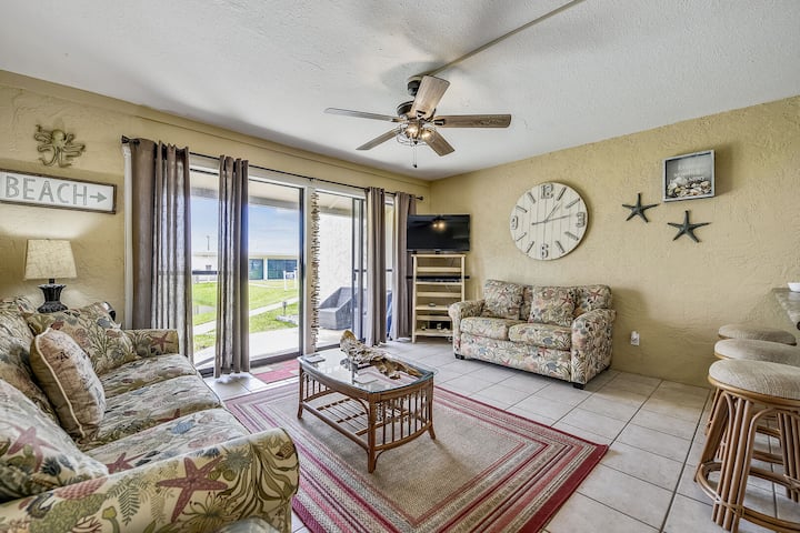 This dog friendly 2 bedroom condo with lake view is conveniently located on the ground floor at Sugar Beach Condominiums. The spacious open floor plan features tile floors throughout making it the perfect vacation home for you to bring your dog! A tasteful décor of muted colors and distinctive nautical accents give this unit a warm distinguished style of its own. The full size kitchen has been updated with modern appliances and plenty of cookware for easy meal preparation. A breakfast bar and cozy table setting complete this convenient dining area. Each bedroom has been well decorated in elegant maritime style. Enjoy a serene lake view the tranquil sounds of nature while relaxing on your own private furnished patio. This picture perfect vacation retreat will accommodate 6 guests (including infants under 2 yrs. old) comfortably.
