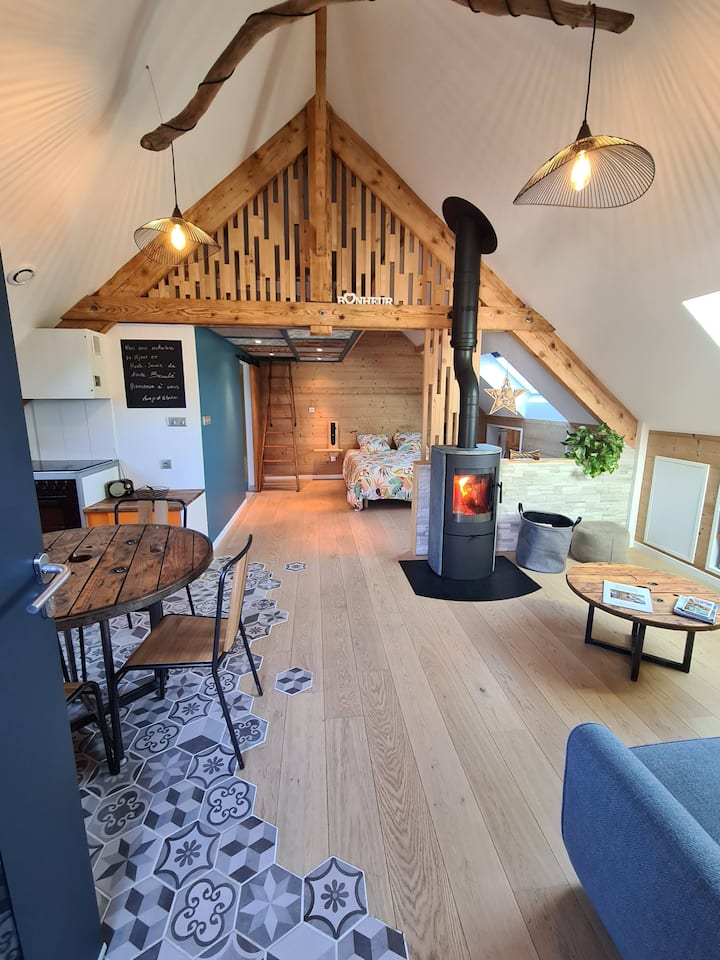 It consists of a fully equipped kitchen (except dishwasher), open to a living room that has a fireplace. The living room is open to a bedroom with a queen bed (160*200) where there is access to a bathroom with shower and toilet. A ladder allows access to a mezzanine with sleeping area (140*190) rather recommended for children or teenagers (1.50 m high).