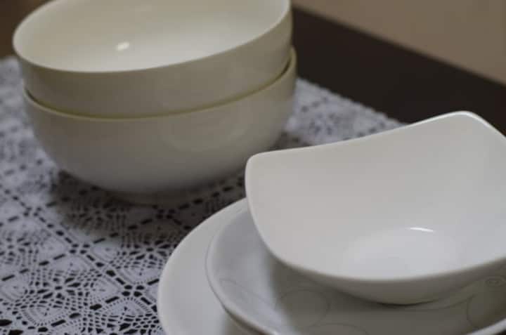 * Tableware (glasses, forks, spoons, knives, plates)