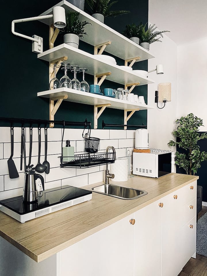 The kitchenette is fully equipped – a stovetop, coffee maker, fridge with freezer, and all the necessary utensils in case you’d like to cook or simply enjoy breakfast in your pajamas.