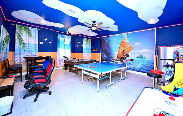 **Moana’s Game Room** (1st floor): Join Disney's Moana on an adventure to strengthen family bonds and discover your inner courage. After an exciting game of ping pong, billiards, air hockey, or any of the three arcade games (Arcade1UpBandai Namco Entertainment Legacy Edition, Arcade1UP - 14 Games in 1, Street Fighter II Turbo, Arcade1UP Marvel VS Capcom), you can unwind with a refreshing beverage that have been cooled in the the second refrigerator and relax at the bar table.