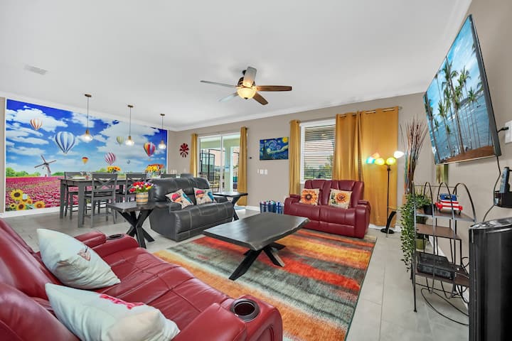 Just a three-minute walk to Storeylake water park and clubhouse, which provides our guests with free unlimited access. This accommodation is perfect for families, work trips, staycations, and vacations. Each room is uniquely themed to transport you around the world, whether in reality or fantasy. We're located just four miles from major Disney theme parks, with quick access to all of Orlando's attractions.